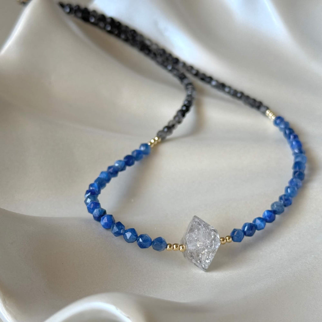 Herkimer Diamond, Kyanite and Tourmalinated Quartz Golden Necklace